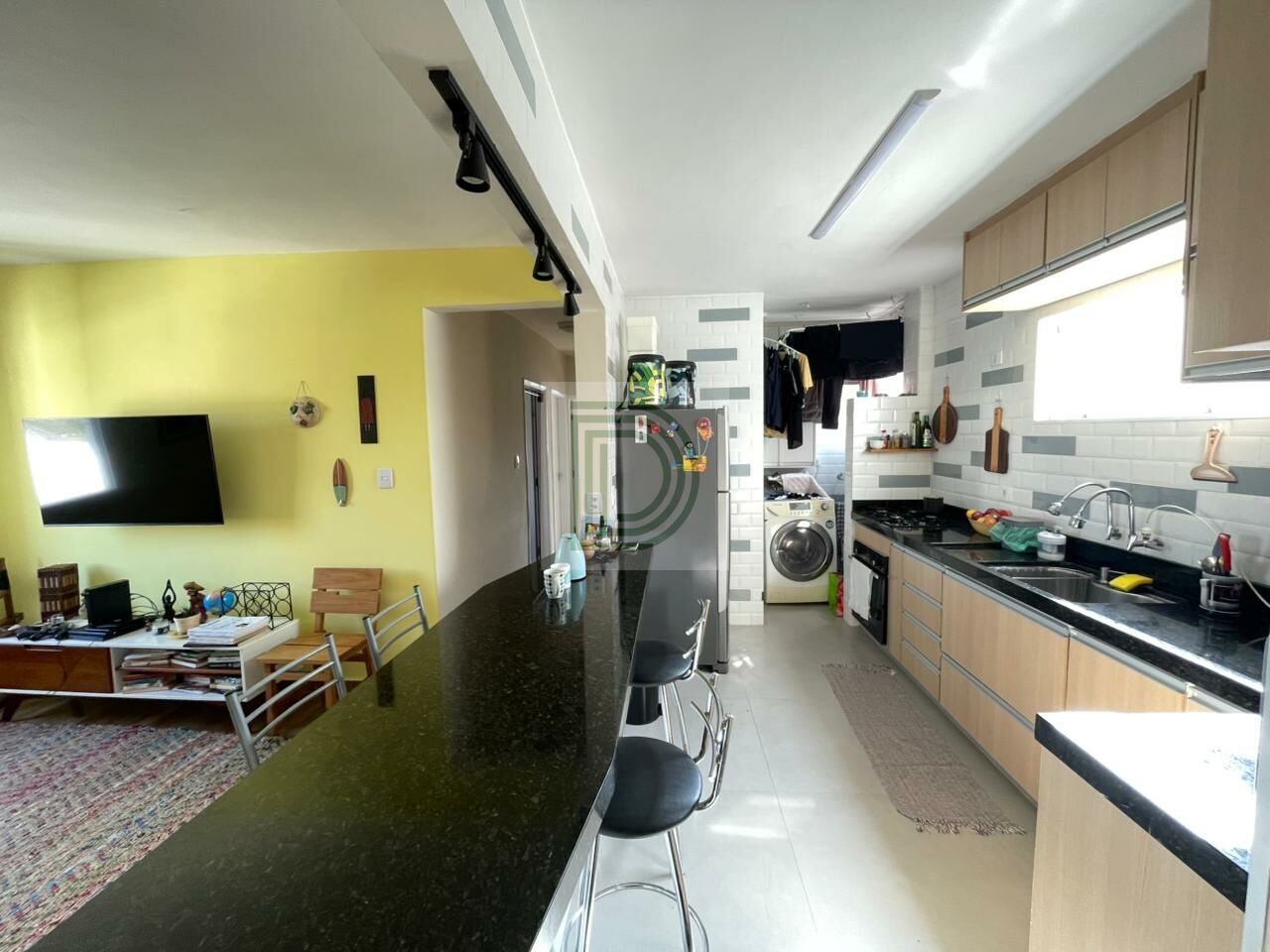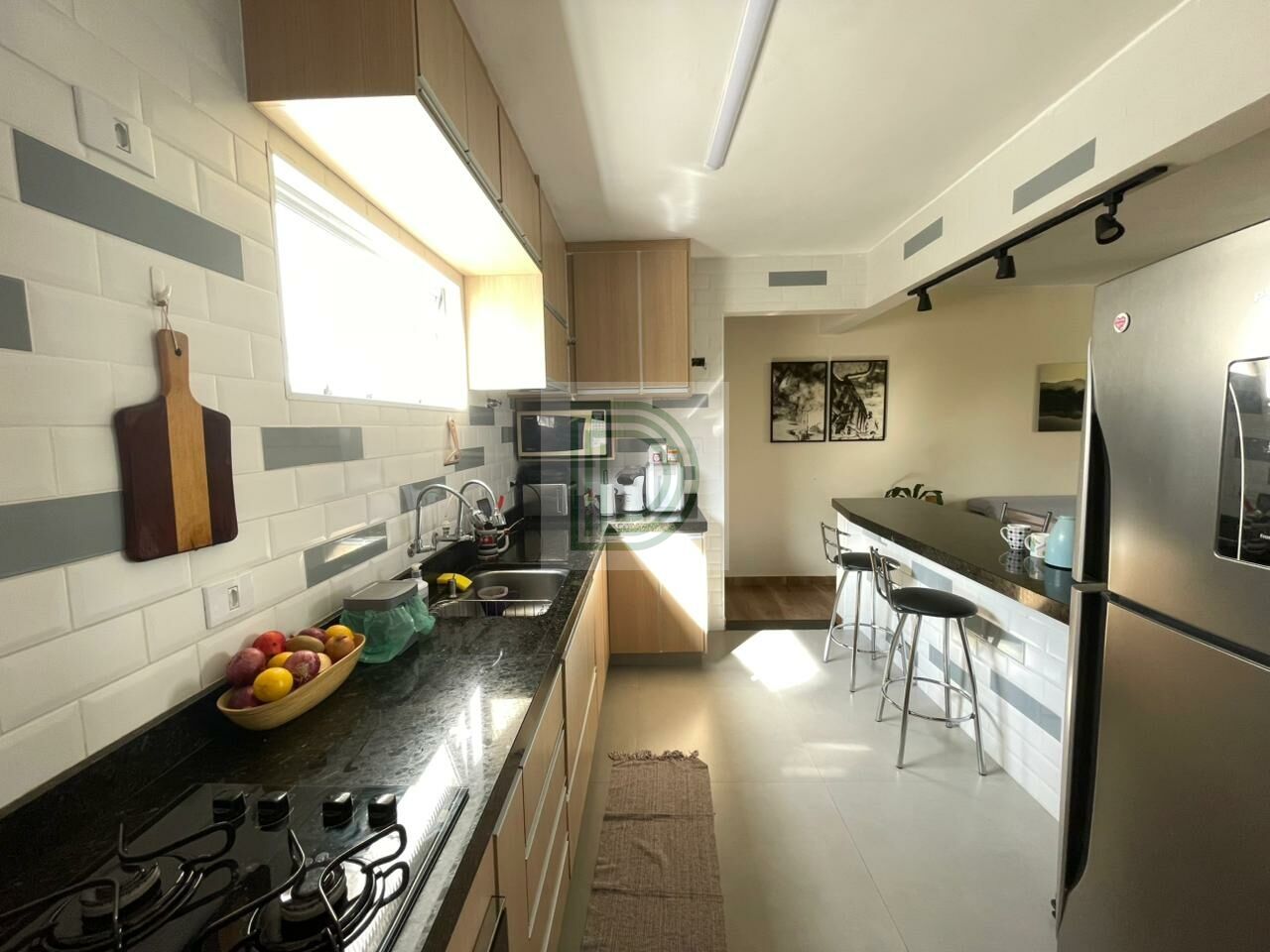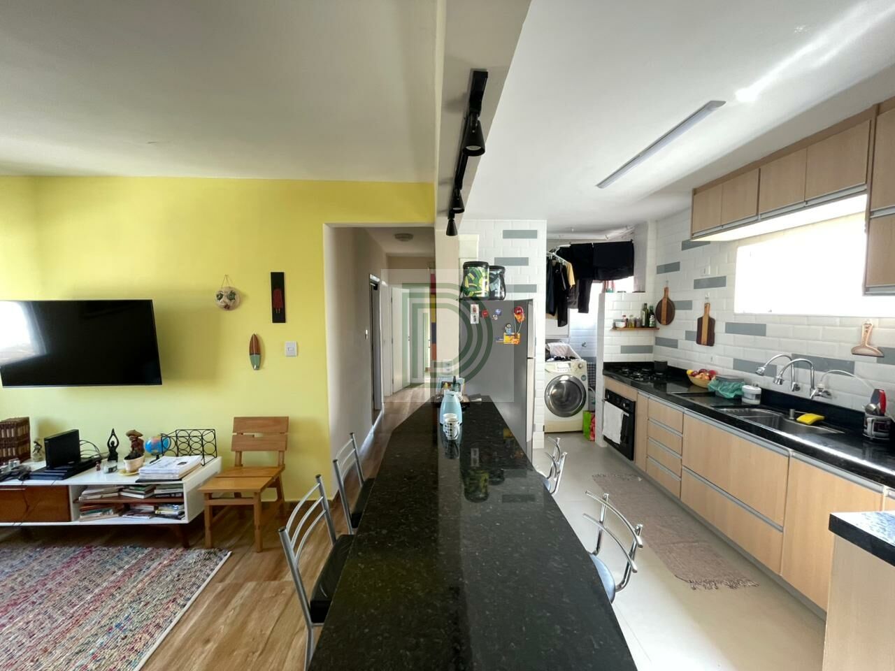 Cozinha americana planejada integrada à sala de estar e jantar