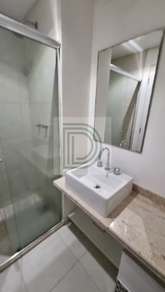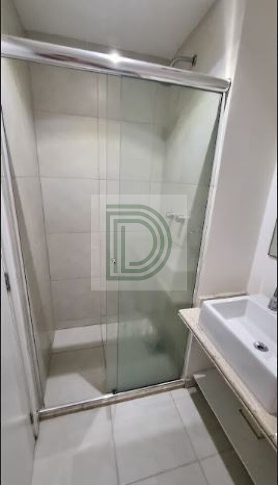 Banheiro com box de vidro, espelho e gabinete