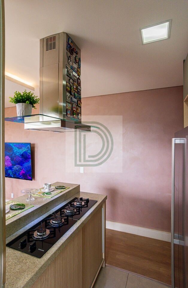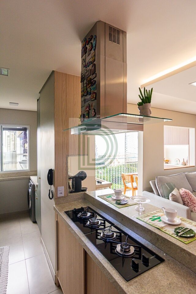 Cozinha integrada com cooktop e coifa de ilha