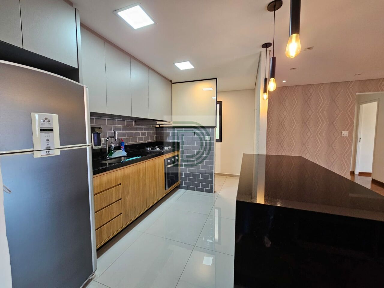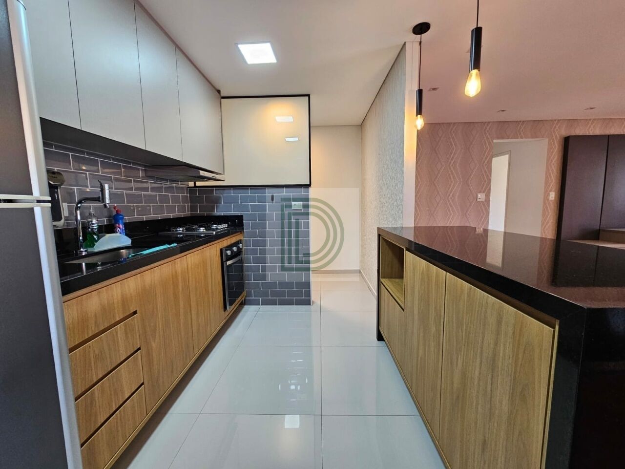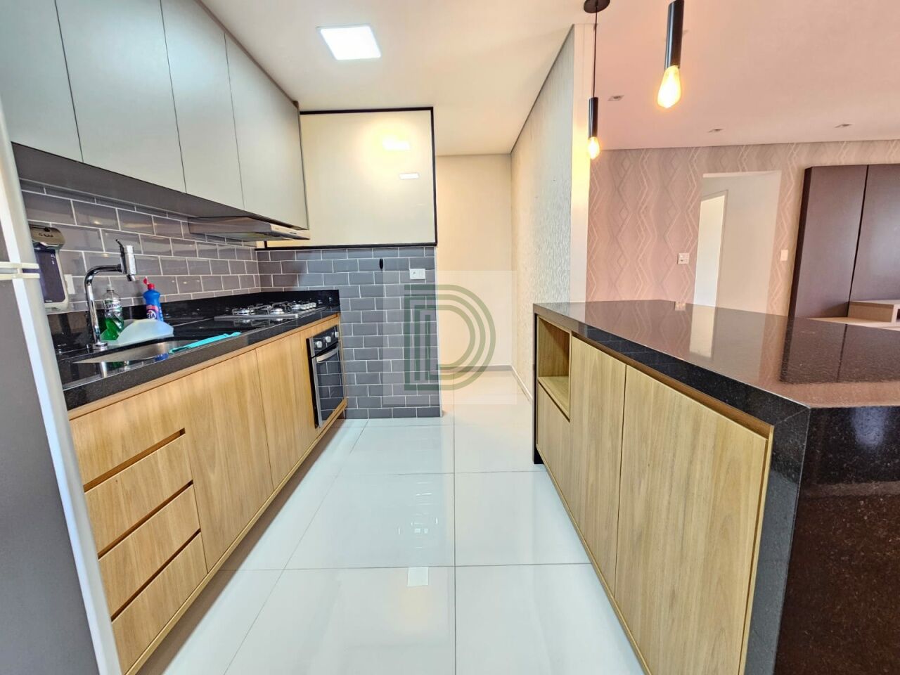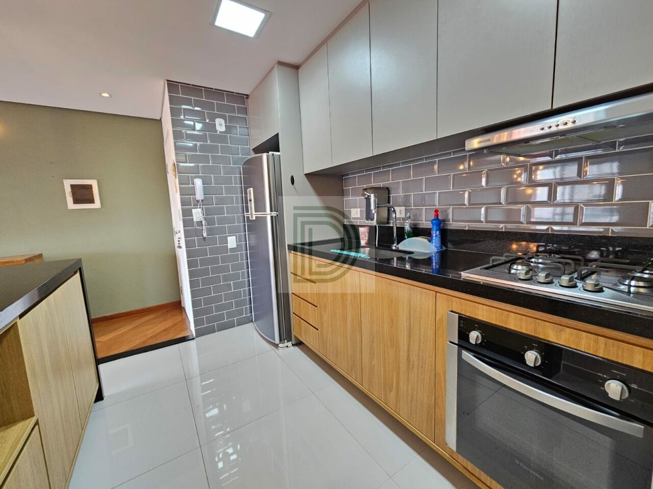 Cozinha equipada com forno, cooktop e coifa