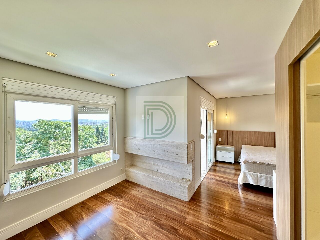 Suíte master com ar-condicionado, closet Sr. e Sra., hidromassagem dupla e lareira